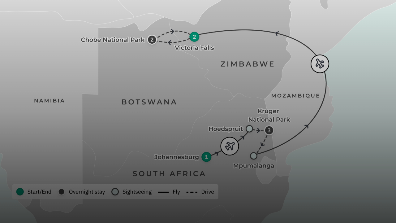 - Starts in Johannesburg. Ends in Victoria Falls – 9 days, 5 places, 3 countries